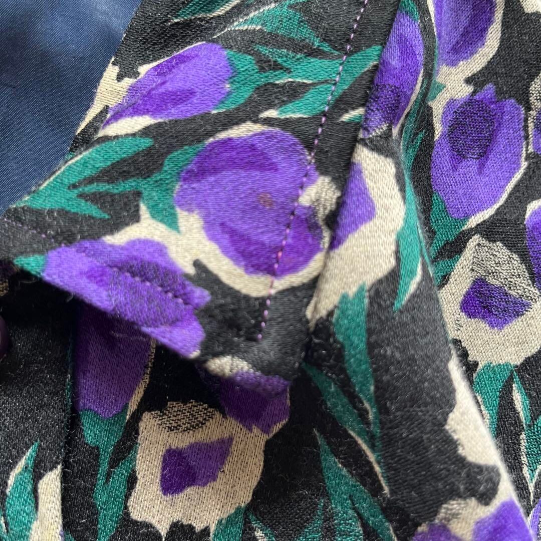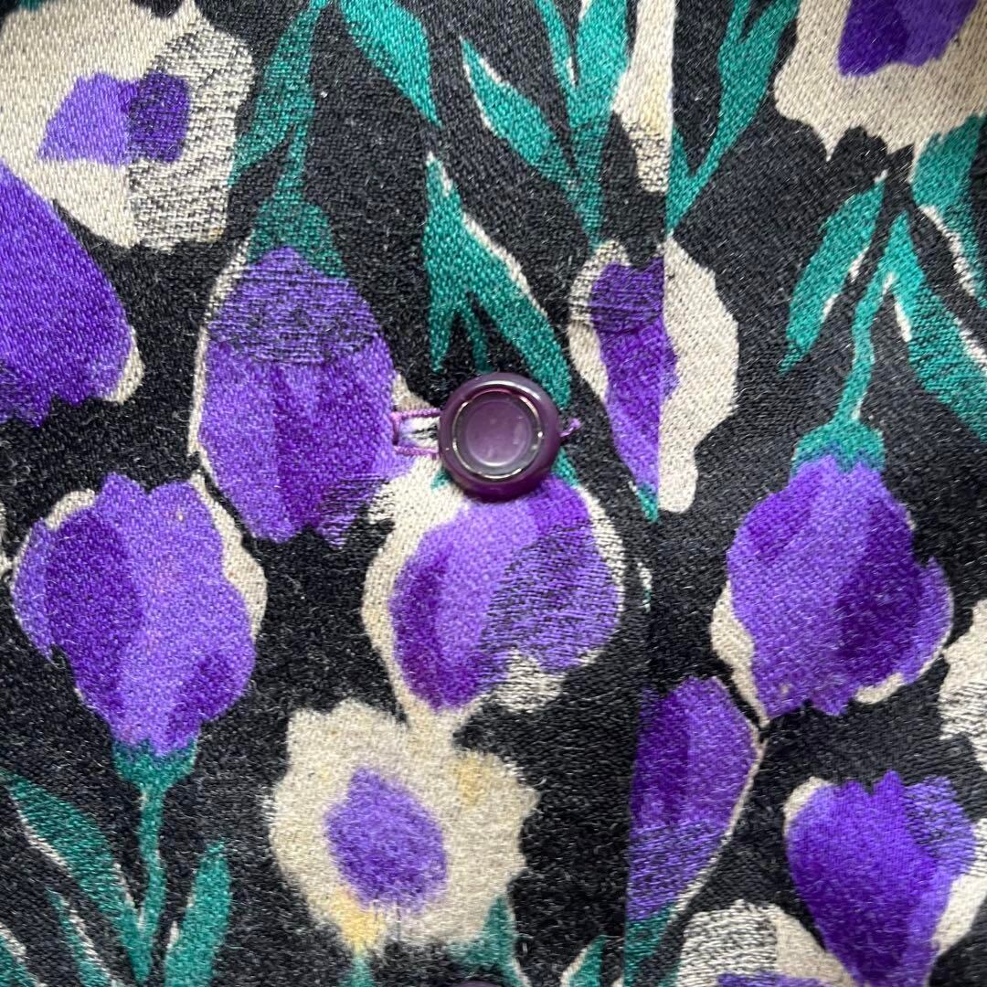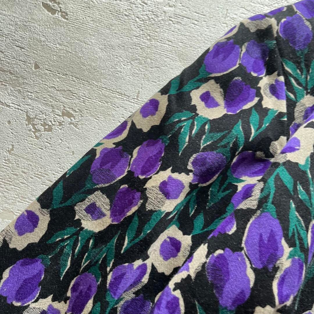昭和レトロ感のあるチューリップモチーフの花柄ワンピースです。深みのある紫を基調に、グリーンとベージュを組み合わせた華やかな配色が目を惹きます。ベルト付きでウエストマークができ、Aラインに広がるシルエットが女性らしさを引き立てます。さらりとした着心地で秋冬コーデの主役にぴったり。普段使いはもちろん、ヴィンテージ好きや古着女子コーデにもおすすめです。1枚で存在感があり、羽織りやコートとの相性も抜群。レトロ感を大切にしたい方にぜひ。