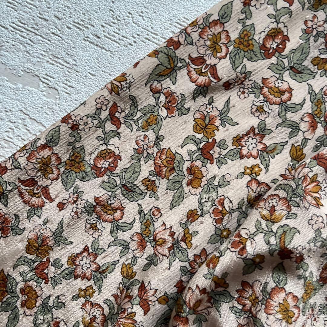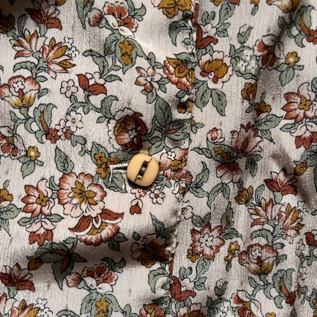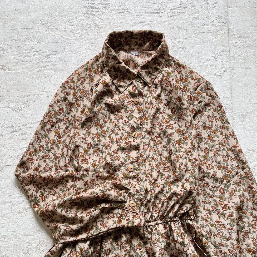 落ち着いたベージュ系ベースにレトロな花柄が映える、長袖ロングワンピースです。ウエストには同柄のベルトが付属しており、シルエット調整が可能。プリーツ風のスカートデザインで動きがあり、クラシカルで上品な印象を与えてくれます。裏地なしで軽やかに着られるため、春秋はもちろん、冬はニットやカーディガンと重ねてもおしゃれに楽しめます。古着女子やヴィンテージスタイルがお好きな方におすすめの一枚。レトロファッション、ナチュラルコーデにもぴったりです。
